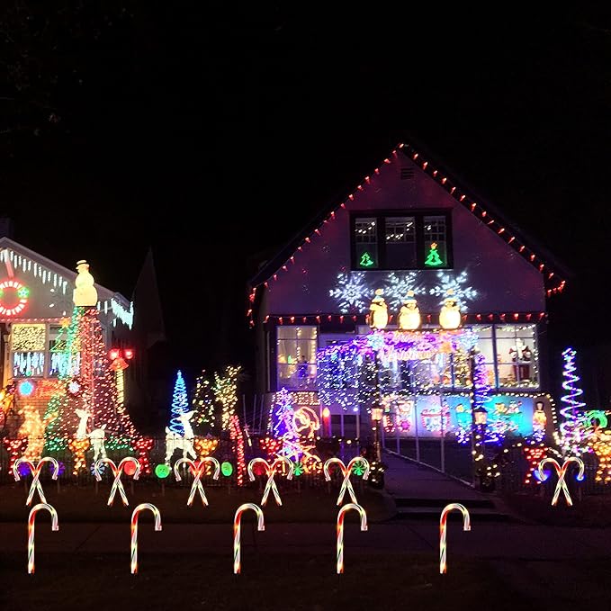 - 【Easy to Install】These Christmas outdoor candy cane lights come with 10 ground stakes. Just insert the stake into the candy cane, then press the stakes into the ground.