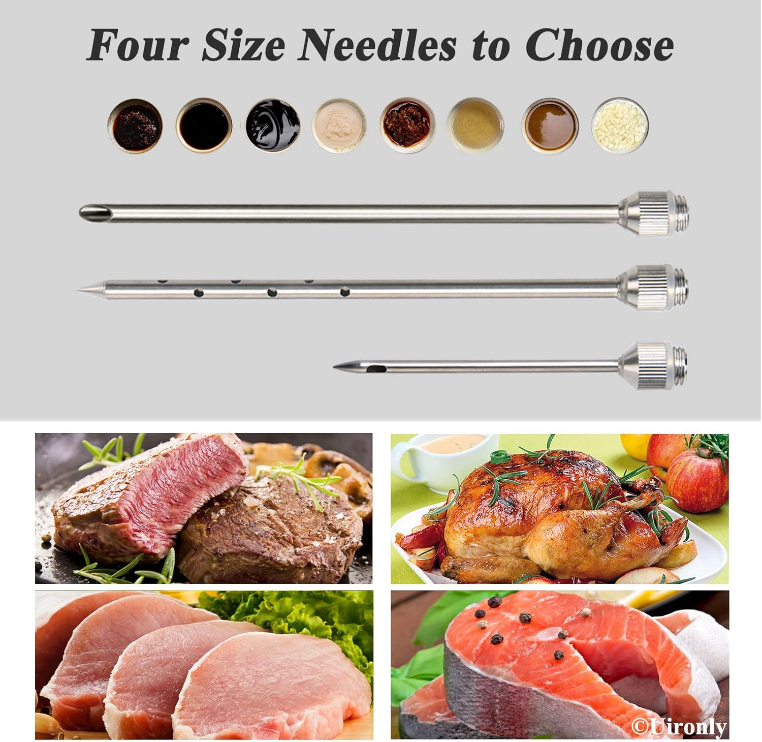 - Professional Flavor Delicious -- Includes 3 Professional marinade needles Syringes. 6 inch needle with 12 small holes for liquids; 6 inch angle-cut needle for injecting marinades with finely-minced puree, chunky or grated; 3 inch needle for precision applications.