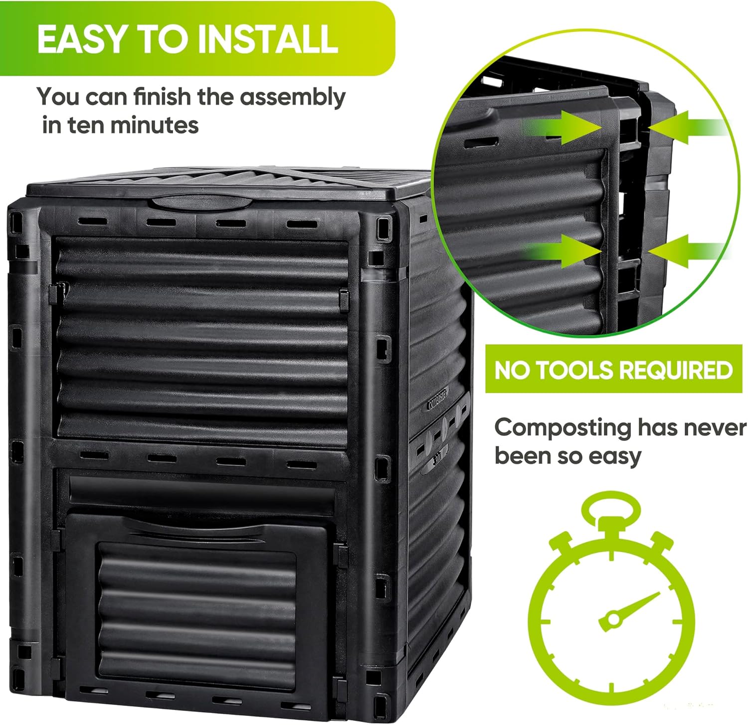 - 【Easy to assemble】-Putting it together is a breeze! This composter is easy to assemble and can be completed in 5 minutes! Tips: A rubber mallet will be helpful for driving the snap lock sections together. You will get one-year warranty, so any problem, feel free to contact us!