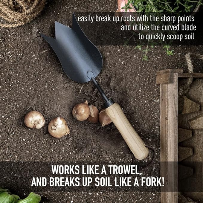 - 【TULIP TROWEL】 - Works like a trowel, and breaks up soil like a fork! An specialized take on the standard trowel, built with sharpened edges and three points. Easily break up roots with the sharp points and utilize the curved blade to quickly scoop soil.