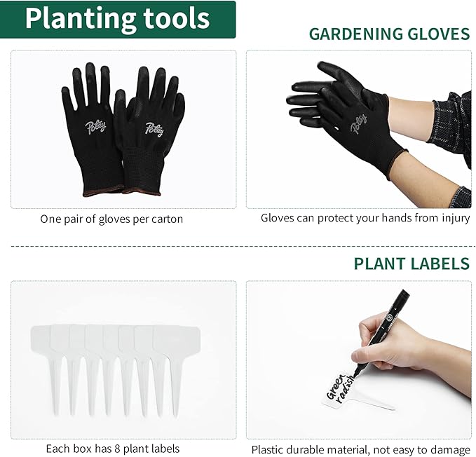 - Complete Set: Includes 2 black fabric covers, gardening gloves, and 8 plastic plant labels for organization and protection
