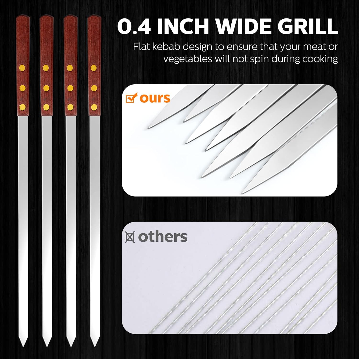 - Sturdy and Strong: these kabob skewers for grilling are made of stainless steel, with solid wood handle, corrosion and rust resistant, does not affect the taste of food, even in the fire is not easy to deformation, can be washed by hand or dishwasher, convenient for long term use