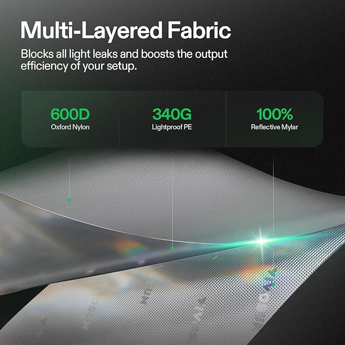 - 100% High Reflectivity: High density 600D Oxford fabric prevents light leakage and keeps your grow area well-insulated; The interior walls, ceiling, and floors are all lined with 100% diamond reflective mylar for multidimensional lighting