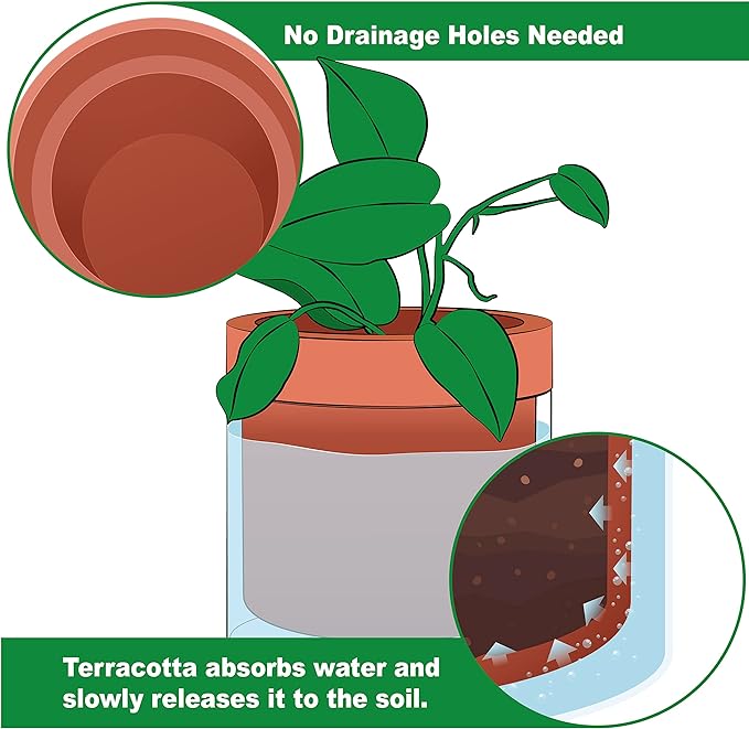 - Self-Watering System: The bottom quarter of the terracotta pot is unglazed, allowing plants to absorb water through the pot walls.
