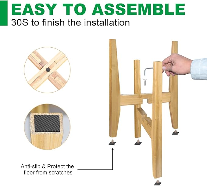 - 【100% Bamboo】 Made of renewable bamboo as raw material, with 2 layers of odorless and environmentally friendly varnish in the surface, which makes the plant stand waterproof, easier to clean and without burrs. Compared with other wood, bamboo stand will not crack and crumble. Instead of other on the market,the thickened thickness and 38cm height of the stand legsmakes the stand more sturdy and will not tip over easily. It can ensure that your lovely plants safe and attractive display.
