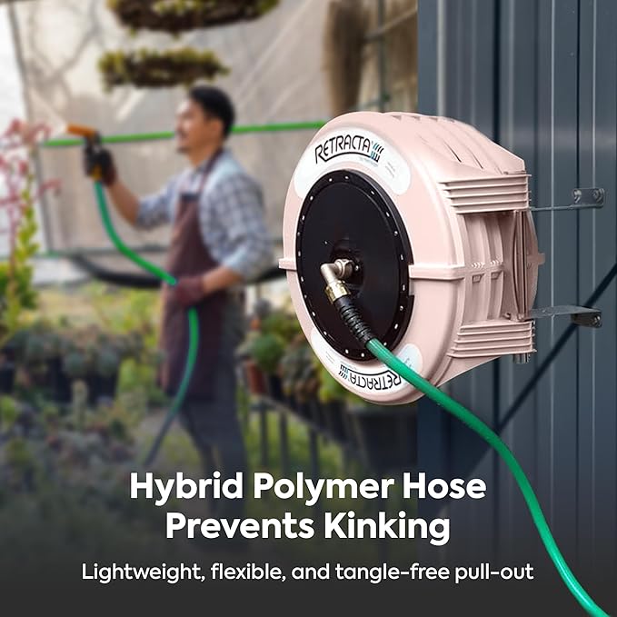 - Prevents Kinking: Our garden hose reels for outside include the Retracts Flex green feeder hose (1/2″x 6.5’) made with hybrid polymer material, this water hose is lightweight and easy to pull out of the hose reel.