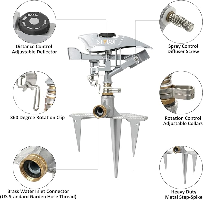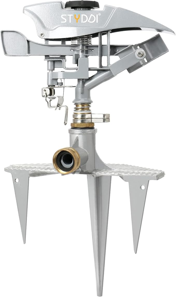STYDDI Professional Heavy Duty Pulsating Sprinkler on Metal 3-Pronged Step Spike, Metal Pro Adjustable Circular Sprinkler for Large to Extra Large Yard, Areas, Lawn, Coverage up to 8500 Sq.FT