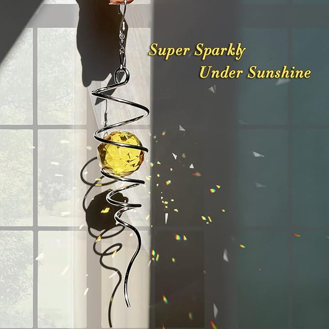- 【PREMIUM CRYSTAL SUNCATCHER】The spiral with crystal is a special sun catcher rainbow maker, it’s Super Sparkly under sunshine. You can also add a motor(not include) to let the spiral to spin ,while spiral tail rotating (it can’t spin by itself.), the crystal ball seems to move up and down like floating and dancing in air while spiral tail rotating, presents the magical visual illusion.