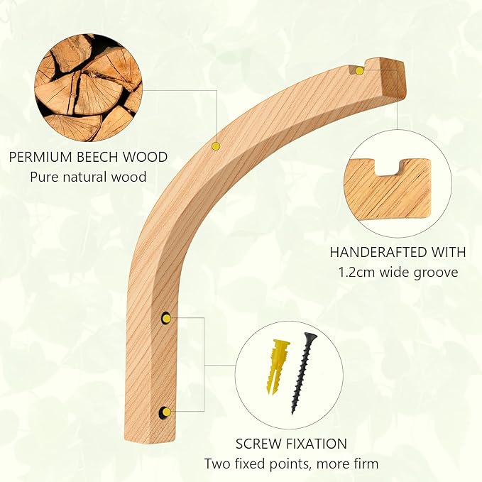 - 🌿【Premium Beech Wood, Excellent Workmanship】 FGSAEOR wall hook made of an improved version of high-solid wood, nice wood grain, handcrafted with care for long-lasting use. It can hold an up to 11" diameter planter without touching the wall and they come with adequate screws for wall studs and universal anchors for other types of walls that can hold a maximum of 15 lbs.