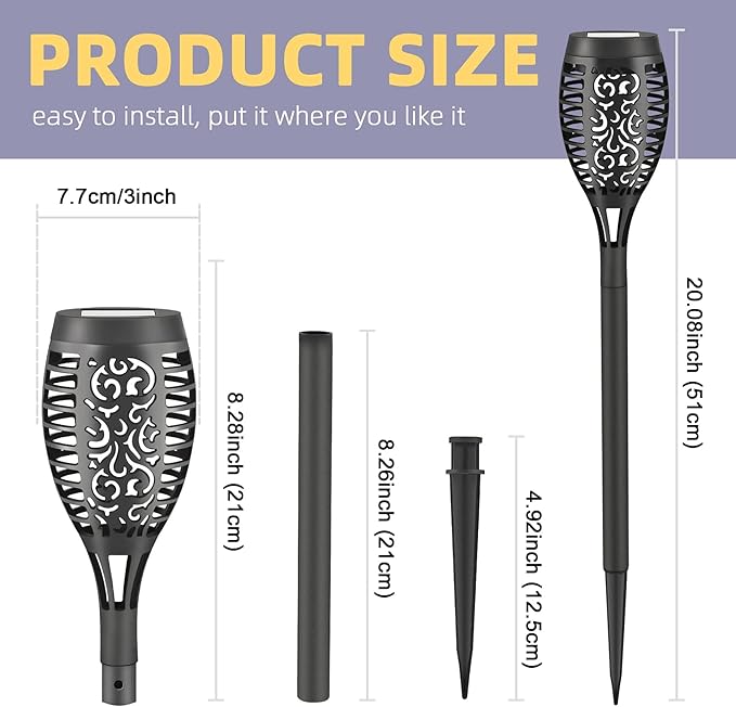- ☀Easy Installation:No wiring required,simply install the torch solar lights anywhere you like and enjoy the real and safe "Flames"!