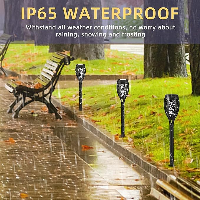 - ☀Solar Torch Lights with Flickering Flame:This kind of solar torch lights are safe alternative to the real "flames", Glowing flames at night create a festive atmosphere and are the perfect choice for outdoor garden, party decor.