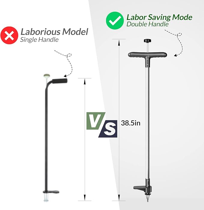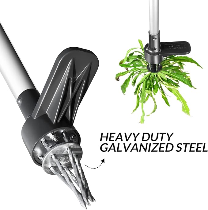 - Standup Weeding Tool For a Better Gardening Experience: Get rid of weeds without risking your back with this long handled lawn weeding tool. The 38โ tall handle lets you uproot the weeds without having to bend over or go down to your knees. The foot pedal lets you put enough force on the gardening weed extractor to penetrate the ground and grab the whole weed, including the roots, so it doesnโt grow back. It is good tools for your garden, backyard, frontyard landscaping.