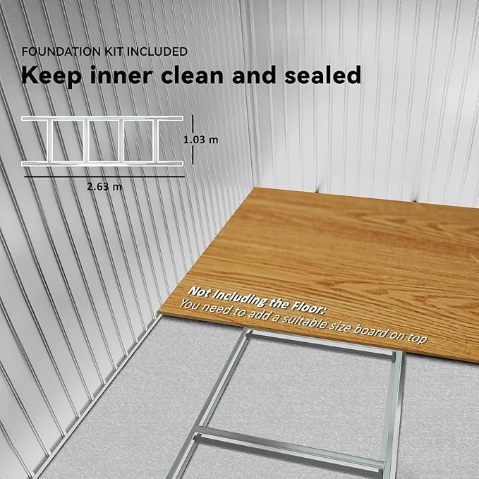 - Weather Ready: This metal shed has a water-safe galvanized steel frame, which makes it great for year-round outdoor use. It also has a foundation kit, which enhances stability by itself or keeps the space clean and sealed as a floor with the help of some wood boards.