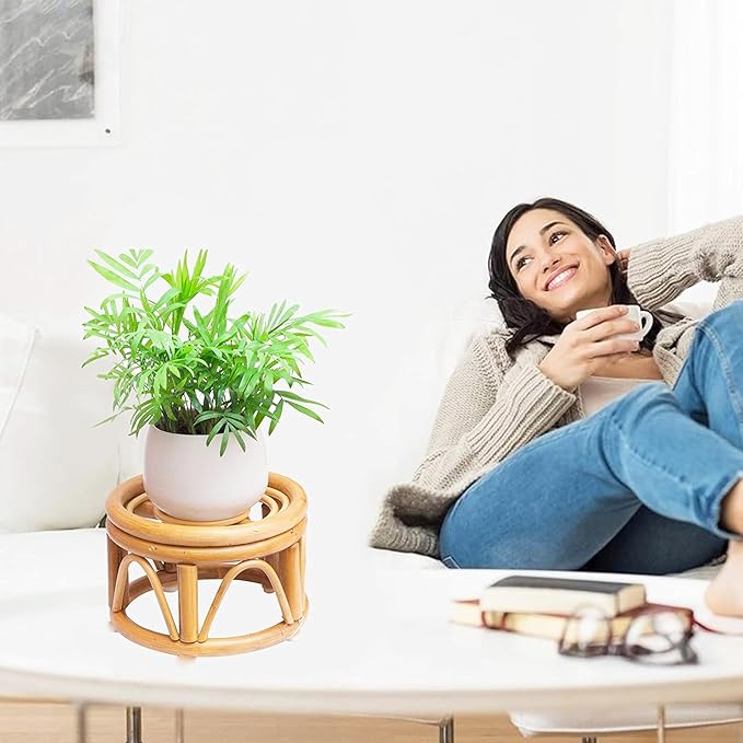 - ☘️ 【SUITABLE SIZE】: The mini size rattan stool display stand is: 6.0 × 4¼ inches, and the small size of our stand is: 8.0 × 4¾ inches. The wicker plant stand has sturdy and durable structure, its 5 thick stand points to firmly support the plant pot. Ideal for your flowerpots. Note: No flower pots !