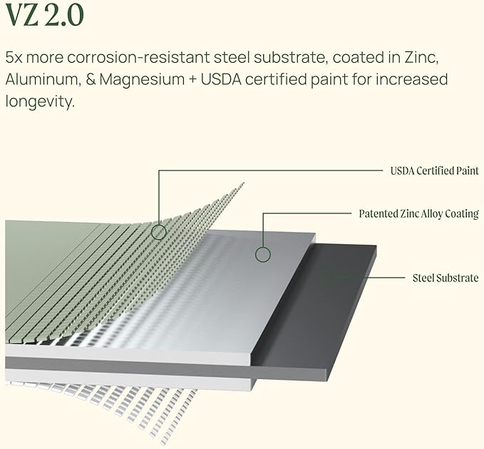 - Better Material: We have combined a Zinc, Magnesium, and Aluminum coated steel with our award-winning and USDA approved AkzoNobel paint to develop a new material which we call VZ 2.0. The first material of its kind is 100% safe, eco friendly, with a long 20+ year life. VZ 2.0โs exceptional performance has been verified at the Texas A&M National Corrosion & Materials Reliability Lab