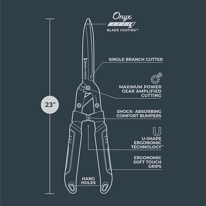 Woodland Tools Super Duty Hedge Shears, 23 Inch Manual Hedge Clippers with 10 Inch Gear-Assist Blades, Power Notch, and Non Stick Coating, Heavy Duty Trimmer for Thick Shrubs and Hedges