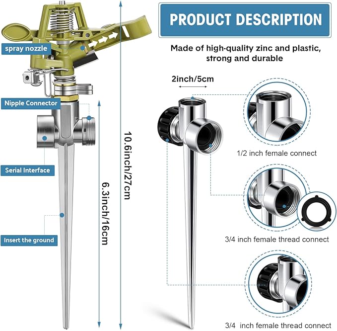 - Heavy Duty Sprinkler: the sprinkler heads are made of quality zinc alloy with golden printing, water resistant and corrosion resistant, which ensures stable performance and constant use; The zinc pulsating sprinkler is equipped with 8 practical and flexible rubber O rings for preventing water leaking
