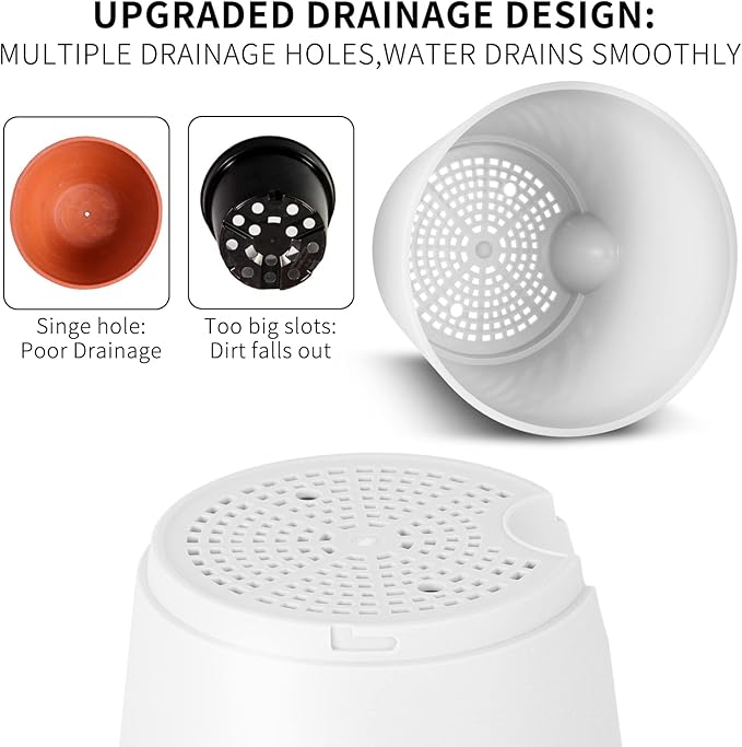 - 【Excellent Drainage Holes and Watering Lip】These flower pots for plants come with multiple drainage holes in the bottom. The holes and watering lip provide an air circulation system for the plant roots, which greatly reduces the problem of root rot of plants in a closed environment. The independent watering lip replenishes water for plants, so that water does not have to pass through the plant itself, At the same time, it is convenient to observe the current water level.