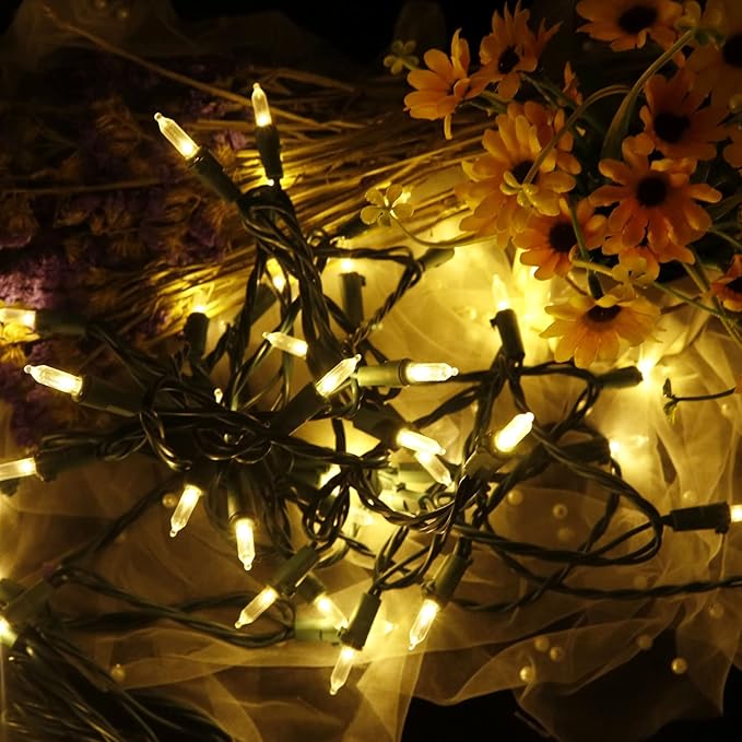 - 【Mini LED Christmas Lights Specification】: 2 Sets - green wire christmas string lights includes 100 count warm white led lights, total length 35.3ft, lights length 33ft and each led is 4 inches apart, 24 inches lead wire, 4 inches end connector (Extra 2 x replacement bulbs and 2 x fuse included)