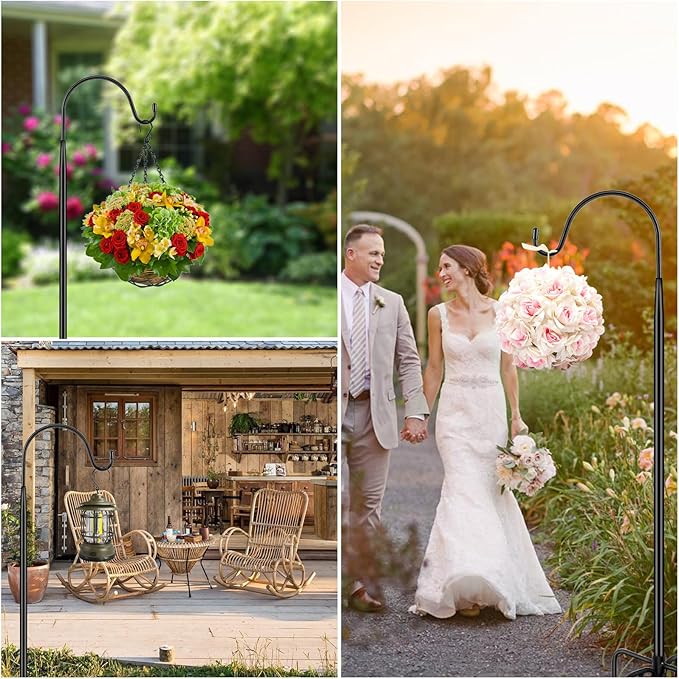 - WIDE APPLICATION: The adjustable shepards hook makes the hook more useful. It can not only decorate the garden, but also hang different kinds of flower baskets, wind chimes, bird feeders, targets, flower balls, lights, bird houses, festival decorations and other things you want to hang. In addition, our shepherd hook is widely used in outdoor weddings.