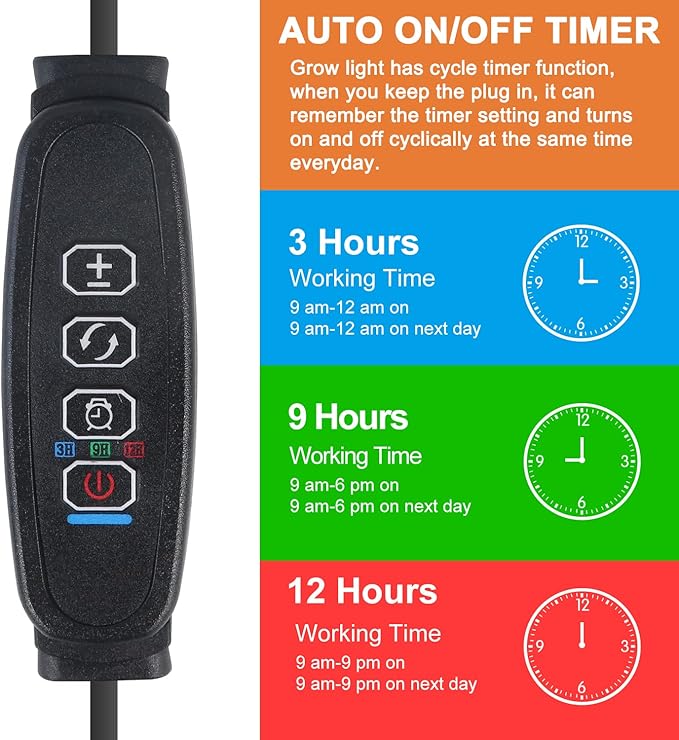 - 🌱【Timer Function & Multiple Settings】The indoor seedling light offer the circular memory timer function with 3 options-3h/9h/12h. When keeping power, it can automatically turn on and off every day according to your settings.【 You Could Operate One of Them Separately and Support 5 Levels of Dimming.】