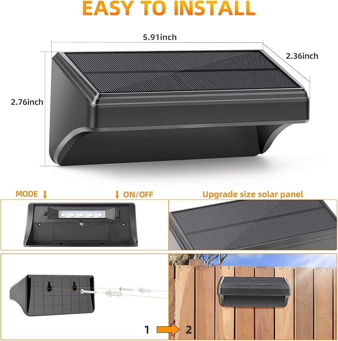 - 【Upgrade Size】Aulanto plus-size solar fence lights extend the length of the middle product:(4.13 inches ➡ 5.91 inches), from 3 led beads ➡ 5 led beads, The solar panels are larger than before that can charge faster and store more solar power and illuminate a wider range. Just use two screws (included) or double-sided tape(not included)can quick fasten the solar wall lights to any flat surface like fence, wall, step, handrail, railing, etc.