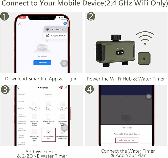 - WiFi Sprinkler Timer: Add the smart water timer to the WiFi hub(only supports 2.4 GHz WiFi) via the Smart Life APP, you can create a watering schedule in the app anytime and anywhere. Don't worry about watering your garden when you are away