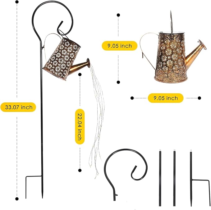 - Easy To Use: Watering can solar lights have 6 flashing Led String Lights and a total of 36 highlight warm white LED Lights and 35-inch shepherd hook, The whole kettle lamp has been installed, just assemble the bracket and insert it into the soil of the lawn, press the solar panel Button(The on/off switch is on top).