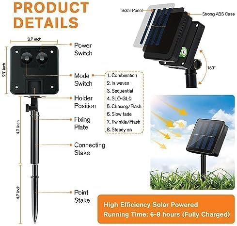 - 8 Impressive Modes Solar Christmas Lights : 4 pack of orange solar christmas lights with 8 diferent light modes: Waves, Combination, Fading, Fireflies, Chasing, Twinkle, Fading slowly, and Steady-on. These Functions fit different occasions, moods, feelings, holidays, festivals, anniversaries, christmas party. Orange christmas Lights easily building greatly the warmly ambience.