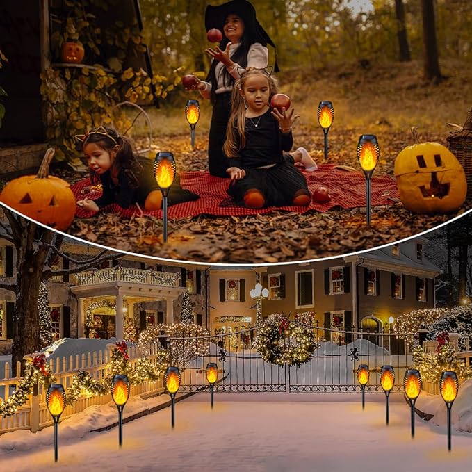 - Solar Powered & Outside Decor: Equipped with high-efficiency solar panel, solar flame torch lights can work up 6-8 hours in summer and 4-6 hours in winter after fully charged. Solar outdoor lights decorative provide vivid outside decorations for party, camping, BBQ and holiday.