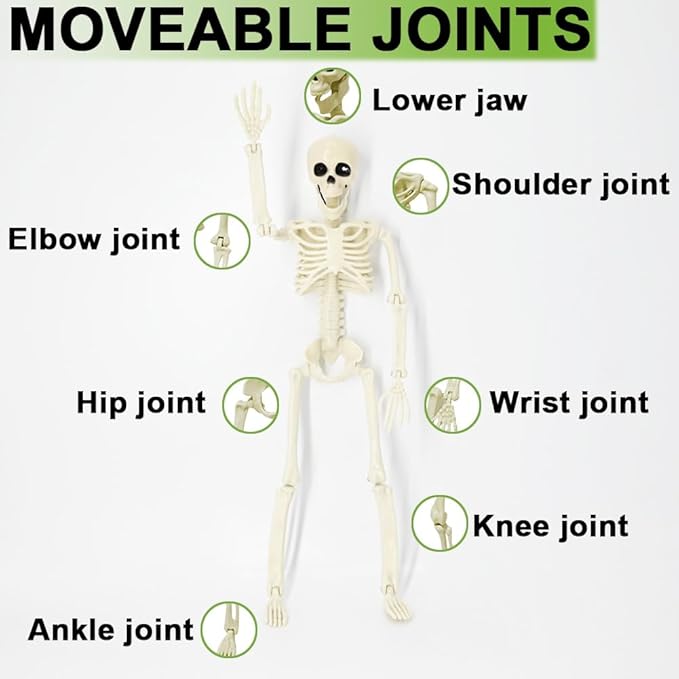 - Posable Joints Skeletons: The Halloween skeletons come with movable shoulder, elbow and wrist joints. Most of the joints are movable, including the head, jaw, shoulders etc. They can It can perform all kinds of movements, such as sitting, walking and so on, you can pose them however you like.