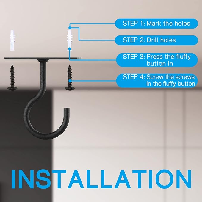 - PACKAGE INCLUDE:Pack of 4 4“ Black Ceiling Hooks with 8 mounting screws Approx 40mm 1.57inch.