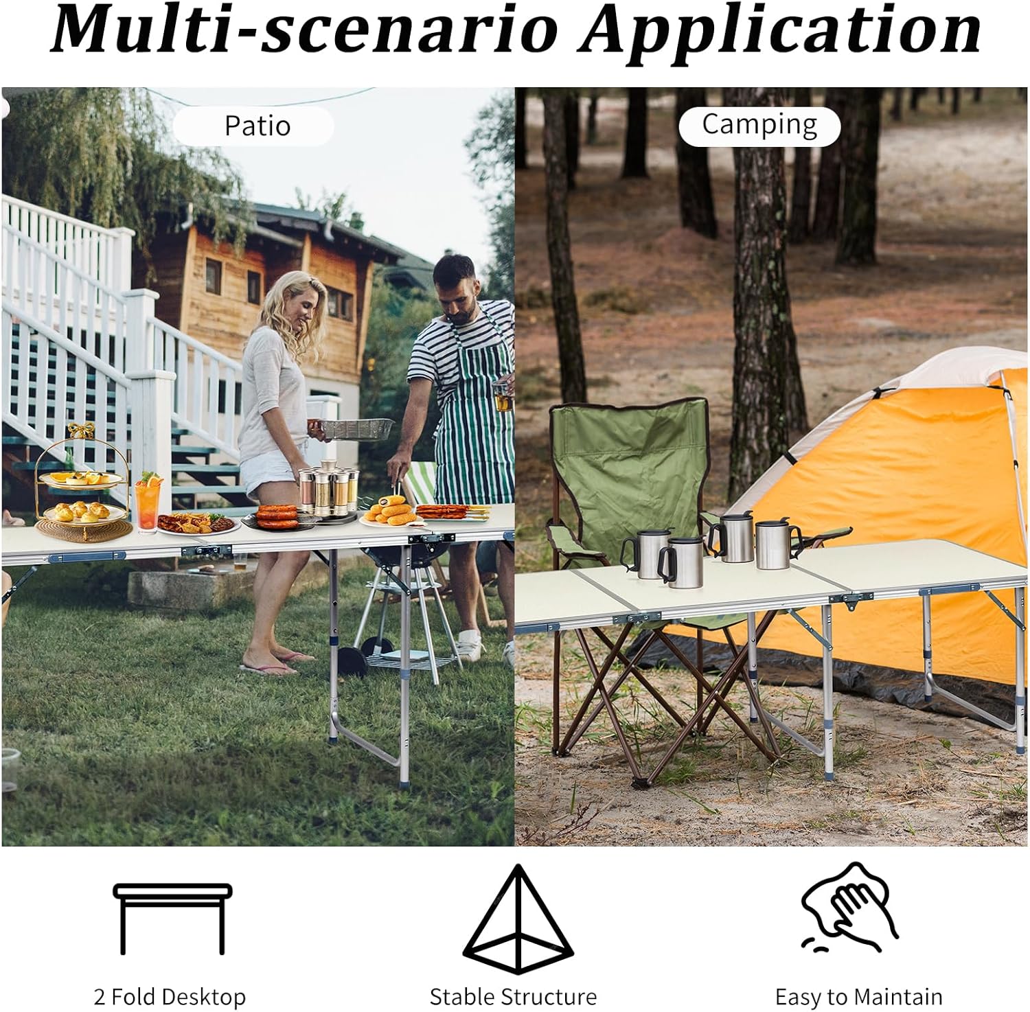 Outvita 6ft Portable Folding Camping Table, Outdoor Waterproof Adjustable Height Table, Aluminum Lightweight Suitcase Foldable Table for Picnic BBQ Beach Dining
