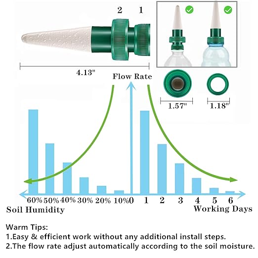 - 1.【Automatic Regulating Water Speed】:A.The advantage of self watering spikes adjust water flow base on soil moisture&density by itself. Plant watering devices doesn't under or over-watering your beloved plants. Contrast other garden water globe,we don’t adjust valve to control water flow manually B.Nail shaped ceramic of plant stakes for outdoor plant go into soil deep not for wetting soil surface.Plant water spikes prevent water evaporation, but also meet the water need in the roots.