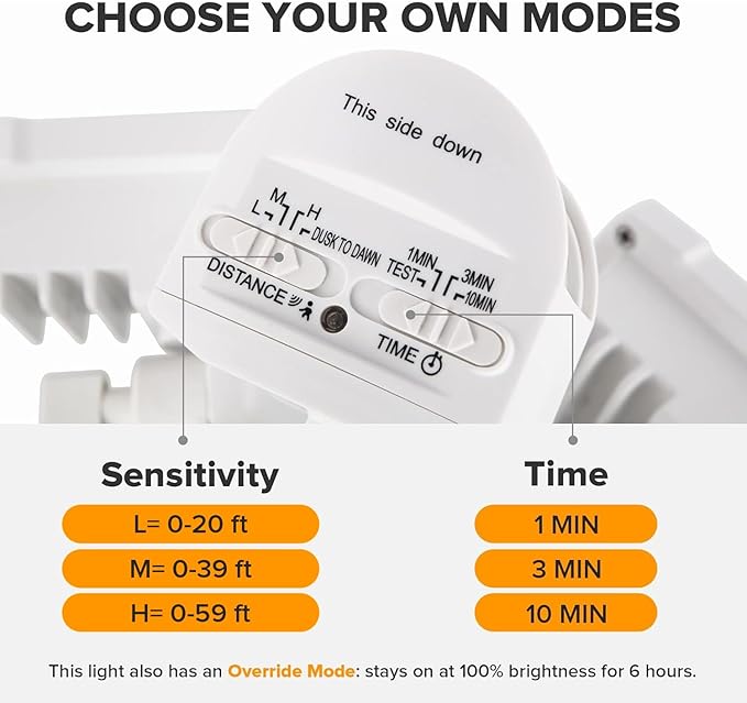 - 【4 LIGHTING MODES】Test Mode, Security Mode, Dusk to Dawn Mode and Manual Override Mode. Manual override mode allows light to operate constantly for selected period of time. More choices can meet different demand for each customer. Choose the most appropriate mode for your needs and desires.