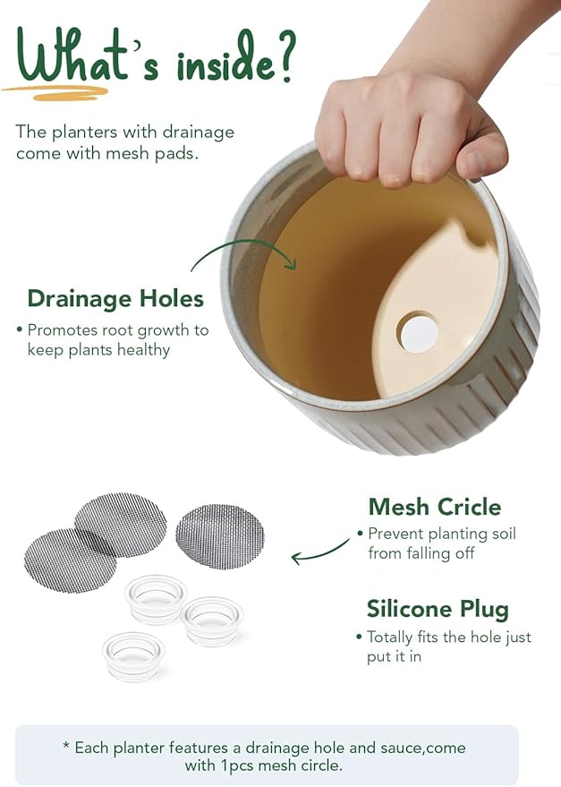 - Custom Drainage Planter System: Each ceramic plant pot includes a drainage hole, silicone plug and mesh pad—leave open for quick runoff or insert the plug to slow moisture, tailoring care to cactus, herbs or tropical foliage