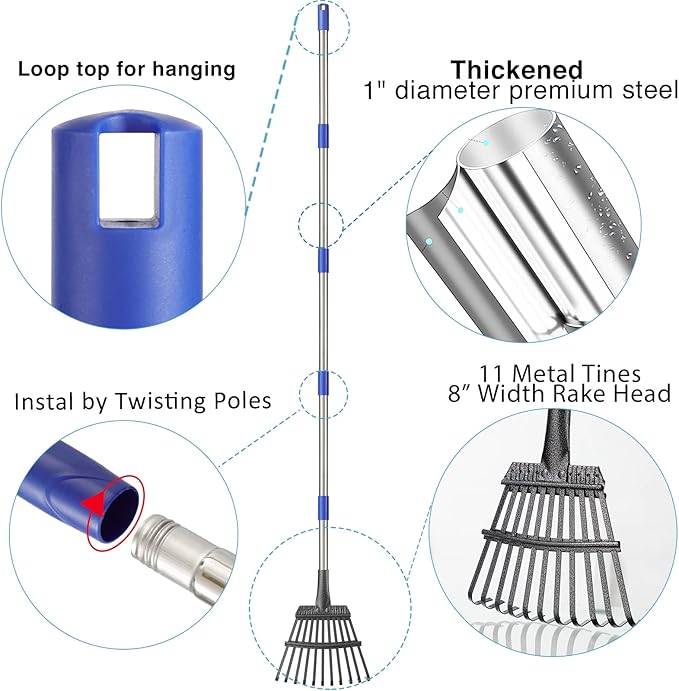 - 11 sturdy metal tines head will help you easily clean all kinds of leaves, pine needles, small debris, grass clippings under hedges, flower beds, chicken coops, narrow areas without damaging plant feeder roots.