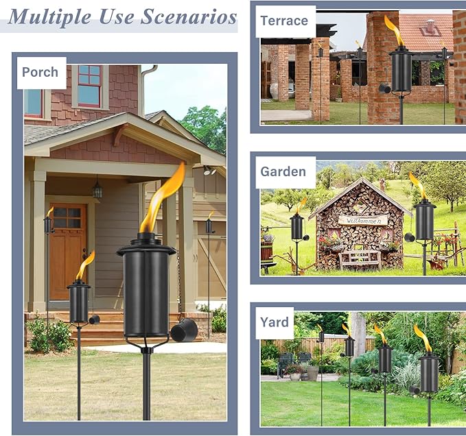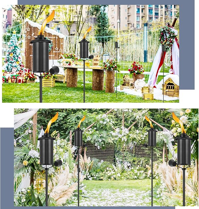 - 🏡Outdoor Décor:This torch features a distinctive black finished metal design,can DIY Height, a long-lasting fiberglass wick & metal snuffer to safely extinguish the flame at any time.Suitable for a variety of theme parties, making the outdoor environment romantic and cozy.