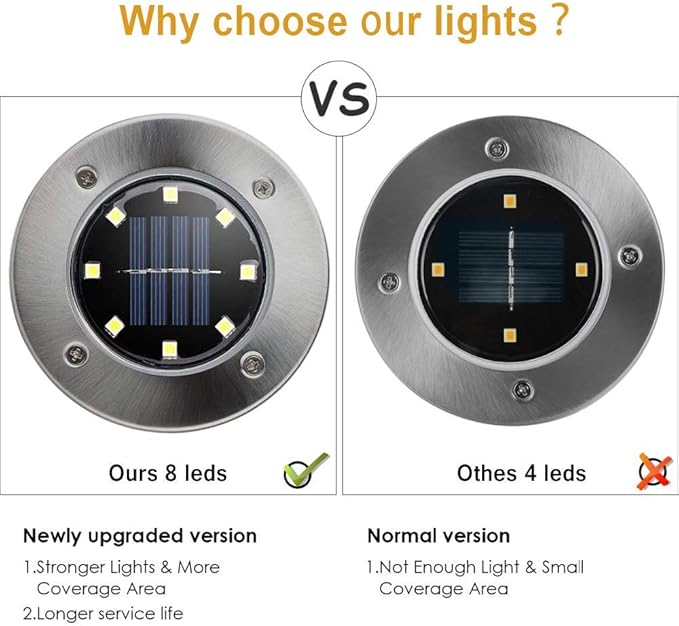 - High Efficiency Light: Our upgraded solar lights with built in 600 mAh NiMH large capacity rechargeable battery, can light up for 8 hours after fully charged, maintain a continuous and well illumination even though on occasional rainy days and cloudy days