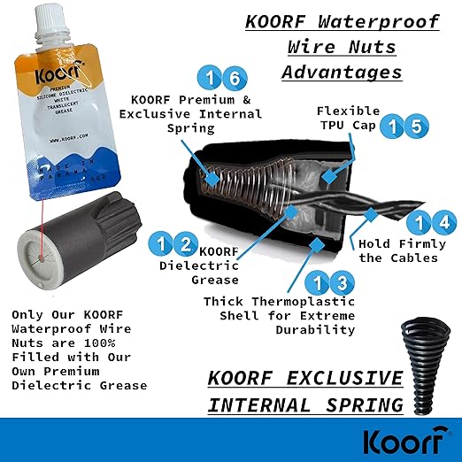 - ✔ APPLICATIONS IN MANY INDUSTRIES, PROBEN RESISTANCE TO VIBRATIONS: All our Waterproof Wire Nuts are Filled only with our Own KOORF DIELECTRIC GREASE, tested in Pumps, heavy equipment, and used as automotive electrical connectors with a top-of-market vibrations resistance. OUR DIELECTRIC GREASE is also available on Amazon under the part number B0B8XJ5JXP (ASIN) and also in our store. More Reliable: Our waterproof wire connector is RoHS Compliant. / We applied and complied with RoHS testing to protect our customers keeping you and your customers safer and weatherproof.