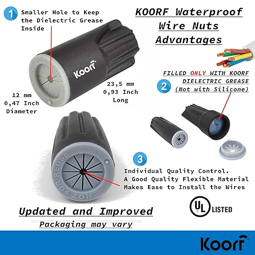 - ✔ UL LISTED & AFFORDABLE 50 PACK, DIELECTRIC GREASE FILLED: Easy-to-use waterproof wire connectors 50 Pack filled with premium KOORF dielectric grease, others products came filled with “Silicone Grease”, “Silicone Sealant” or even only “Silicone” with low-quality sealant, in few weeks that type of sealant will be evaporated or hardened leaving your connectors and wires open to a possible shortcut with all the risks, we only use our own KOORF Dielectric Grease to fill our products.