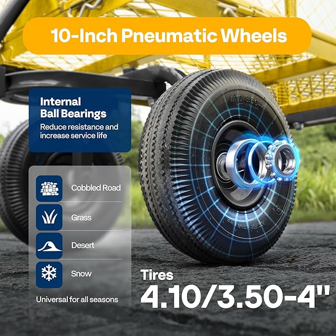 - NOISE REDUCTION TIRES - The load-bearing, shock-absorption, and noise- reduction of the cart are all determined by the casters; The pneumatic tires have good elasticity, impact resistance, and noise reduction; Compared with small wheels, large wheels are able to adapt to various road conditions and have good load carrying advantages; PLEASE BE AWARE that the tires are not fully inflated due to safe transport consideration