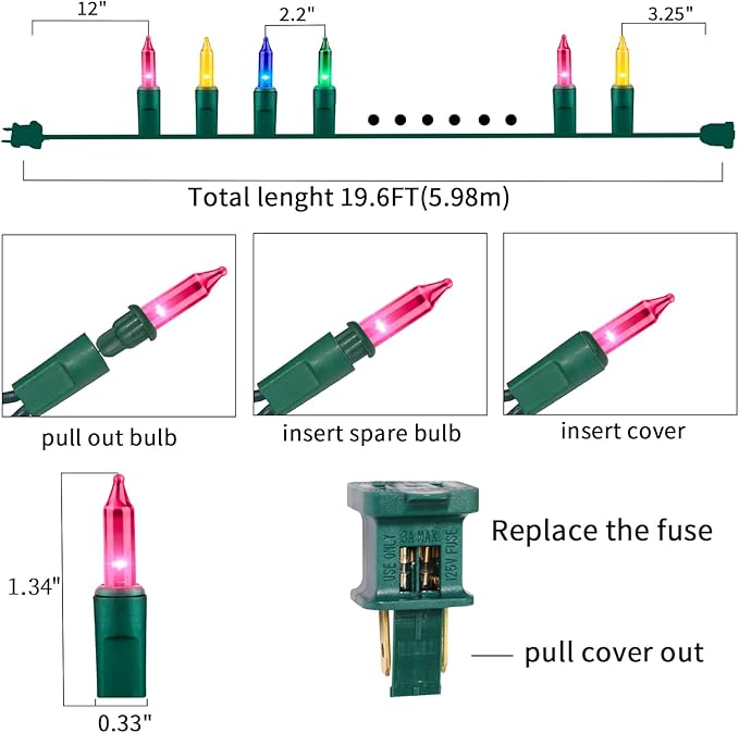 - 【Green Wire Christmas String Lights Decoration】:100L traditional incandescent Christmas light set,19.6Feet Multi Christmas Mini String Lights,each set include 4 Extra Bulbs & 2 Replacement Fuses.Perfect for indoor and outdoor decoration.Plug in,put it where you want,watch and enjoy this light.The light can be reused for many years.