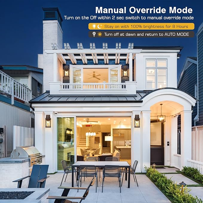 - ✨[ New Generation Of Motion Sensors ] Our outside motion sensor porch light integrates 3 working modes and a simple one-button switching function, ① DIM MODE: 30% brightness at night, 100% light once motion is detected, revert to 30% brightness without movement. ② ECO+ MODE: Full off at night, 100% light once motion is detected, revert to full off brightness without movement. ③ Override Mode: Keep 100% brightness at night. Lights will automatically turn off during Dawn in each mode.