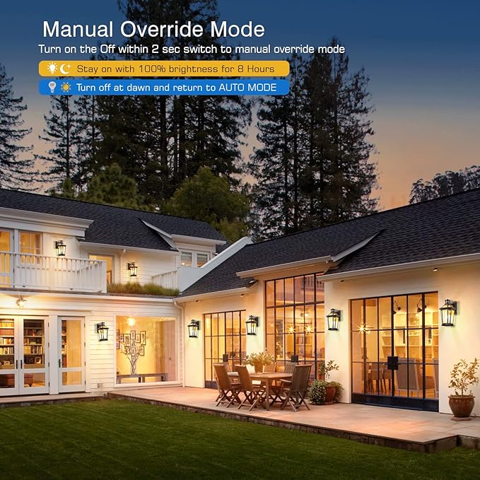 - 🌞[ ALL-NEW Motion Sensor ] Our porch lights outdoor integrates 4 working modes and a simple one-button switching function. ①DIM mode: 100% brightness at night when motion is detected, and 30% brightness the rest of the time ( adjustable from 10% to 50%). ②ECO Mode: Keep the light off at night, and turn on the light at 100% brightness when motion is detected. ③D2D mode: 100% brightness at night, automatically turn off at dawn. ④Override Mode: Maintains 100% brightness for approximately 8 hours, but automatically turns off at dawn and reverts to the previous operating mode.