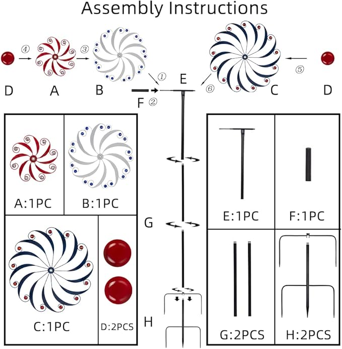 - Stable Standing: The metal stake of the large wind spinner contains 4 strong metal prongs that are solid enough so that the wind spinner can stand still in the wind. Stick the prongs into the soil, and then you can appreciate the wind spinner rotating in the breeze.