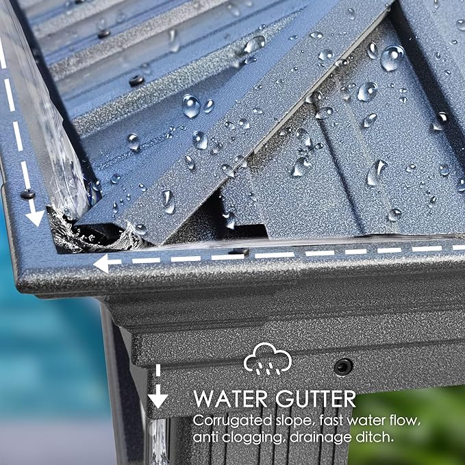 - ✅Metal Canopy/Roof and Gutter Design - The metal canopy of this gazebo ensures longevity and durability. Its roof, made of sheet metal, boasts a robust 29-gauge thickness, which is thicker than most gazebos on the market. its water gutter system ensures that rainwater is efficiently directed away from the edges of the frame and poles.
