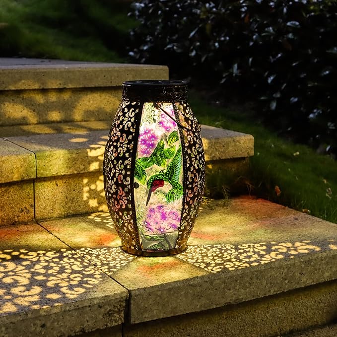 - 【Unique Glass Solar Lantern 】Hanging solar lantern feature a exquisite cardinal pattern, the vintage appearance will be unique addition for your garden or tabletop,and creating warm illuminated charm.