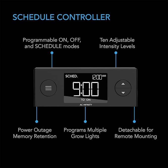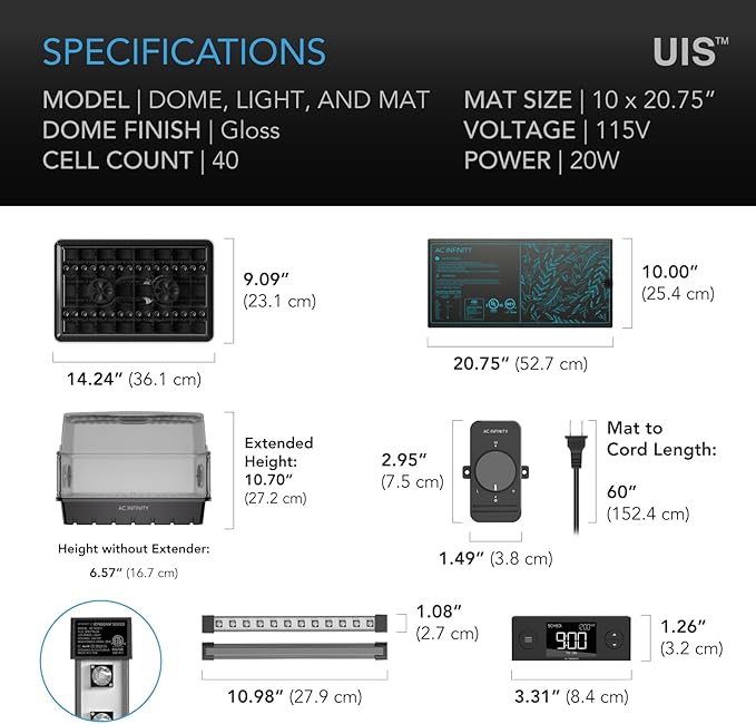 - Durable drip and plant trays with optional height extension panels support up to 40 seedlings and clones.