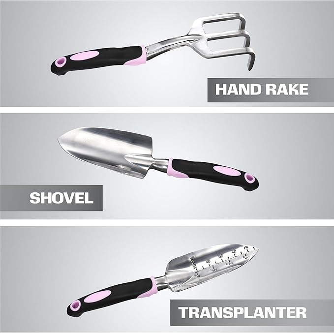 - VERSATILE GARDEN TOOLS: Our set includes a garden spade and hand shovel to help you handle all your gardening tasks. Also, it features a transplanter and hand rake for pruning, digging, and weed control making it flexible enough for all gardening activities